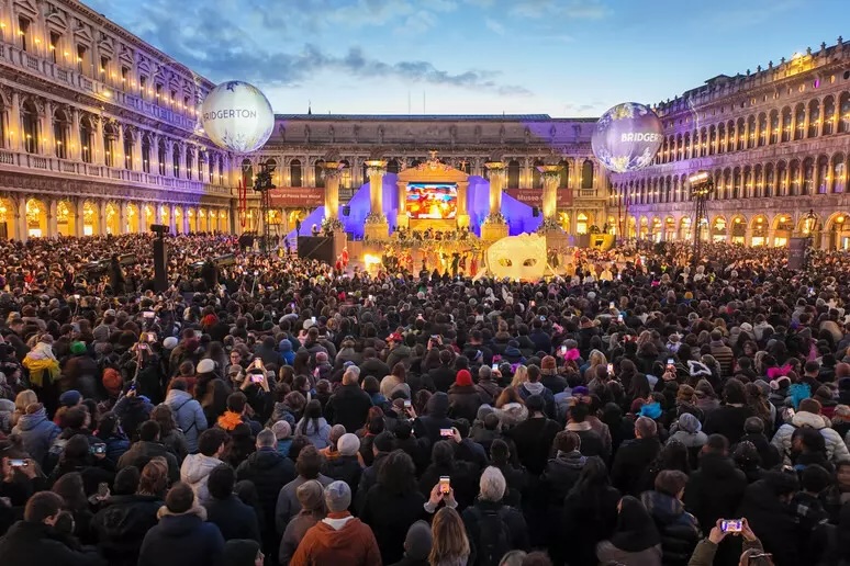 L’evento, realizzato da Netflix per inaugurare il Carnevale di Venezia 2026, ha portato l’universo raffinato della serie direttamente nel cuore della città, offrendo uno spettacolo immersivo che ha trasformato spettatori e passanti in protagonisti di un’esperienza unica. Il Gran Ballo ha visto protagonisti ballerini professionisti, tra danze di gruppo e coreografie sceniche, in sontuosi costumi ispirati all’eleganza dei primi anni dell’Ottocento. Il momento più suggestivo è stata la performance aerea: due ballerini, sospesi su eliosfere, hanno volteggiato sopra la piazza, creando un effetto quasi fiabesco che ha fuso architettura, cielo e coreografia in un unico spettacolo mozzafiato. L’evento è stato anche un omaggio al tema di questa edizione del Carnevale, “Olympus. Alle origini del gioco”: un invito a riscoprire il gioco come linguaggio universale di incontro, condivisione e immaginazione collettiva, capace di unire epoche, culture e sensibilità diverse. Un messaggio perfettamente in linea con la magia della serata, che ha trasformato Venezia in una grande agorà di stupore, eleganza e meraviglia.