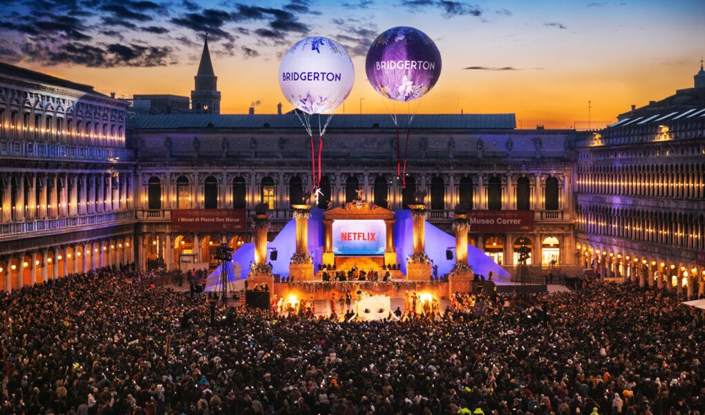 L’evento, realizzato da Netflix per inaugurare il Carnevale di Venezia 2026, ha portato l’universo raffinato della serie direttamente nel cuore della città, offrendo uno spettacolo immersivo che ha trasformato spettatori e passanti in protagonisti di un’esperienza unica. Il Gran Ballo ha visto protagonisti ballerini professionisti, tra danze di gruppo e coreografie sceniche, in sontuosi costumi ispirati all’eleganza dei primi anni dell’Ottocento. Il momento più suggestivo è stata la performance aerea: due ballerini, sospesi su eliosfere, hanno volteggiato sopra la piazza, creando un effetto quasi fiabesco che ha fuso architettura, cielo e coreografia in un unico spettacolo mozzafiato. L’evento è stato anche un omaggio al tema di questa edizione del Carnevale, “Olympus. Alle origini del gioco”: un invito a riscoprire il gioco come linguaggio universale di incontro, condivisione e immaginazione collettiva, capace di unire epoche, culture e sensibilità diverse. Un messaggio perfettamente in linea con la magia della serata, che ha trasformato Venezia in una grande agorà di stupore, eleganza e meraviglia.